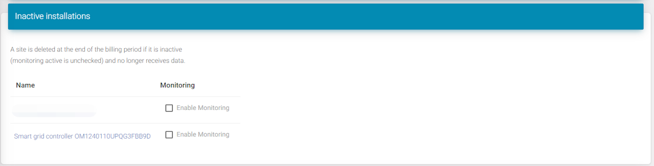 This is the list of inactive buildings. These will not be shown on the portal. To show them press the button 'Enable monitoring' and it will be in the list of active installations.
